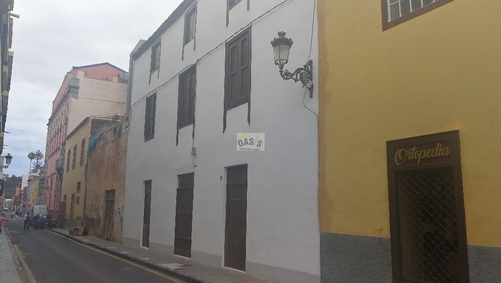 Casa del siglo XVIII-XIX en la calle La Carrera, en plena zona comercial de La Laguna. Con doble fachada. Con 27.44 metros de fachada. Tiene 2 alturas por calle La Carrera y 3 por la otra. La superficie de la parcela son 629.5 m2, total construida de 1.177 m2.