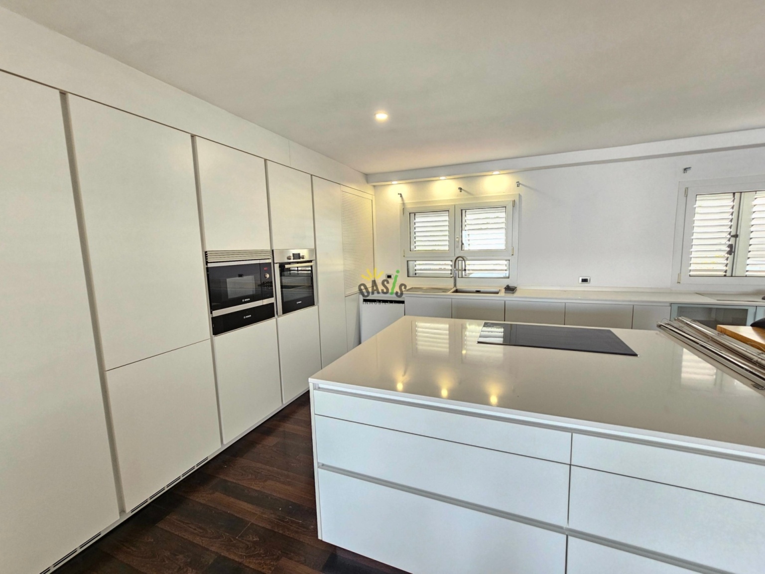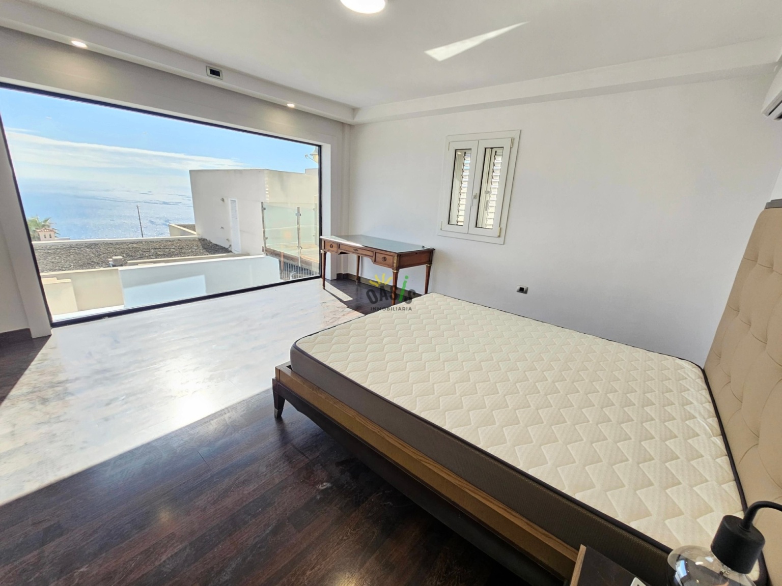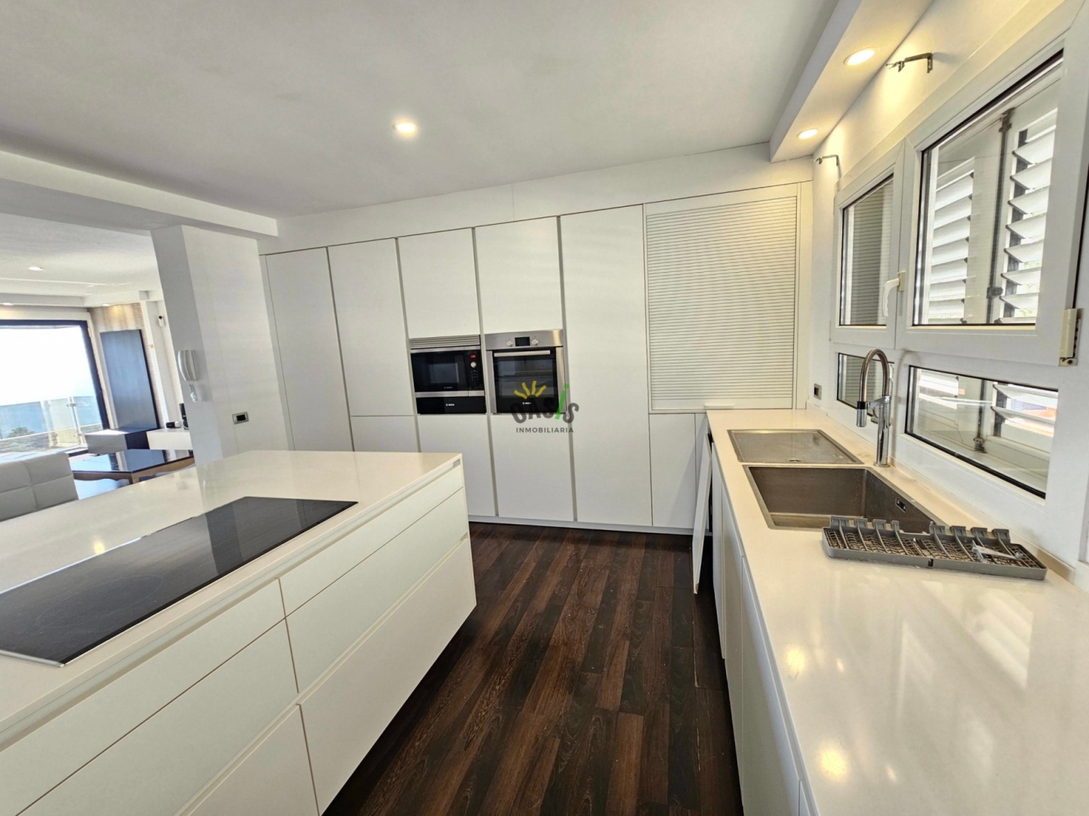 Entramos en la casa por la planta alta donde se ubica un amplio salón comedor de unos 50 m2 con grandes cristaleras orientadas al mar, aportando luminosidad y elegancia a la casa, además cuenta con una majestuosa cocina abierta, totalmente amueblada y equipada con una amplia isla central y gran capacidad de almacenamiento. La misma planta cuenta con 2 amplios dormitorios uno de ellos en suite con  vestidor de considerable tamaño, orientado hacia el mar junto con el gran baño. Además, hay otro baño para asistir al otro dormitorio y la planta de salón y cocina.