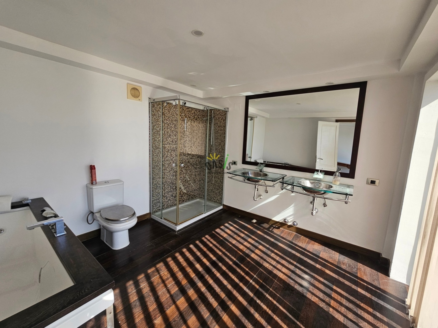 Los suelos de toda la vivienda son de parquet y la carpintería interior es de madera. La casa cuenta con aire acondicionado.
