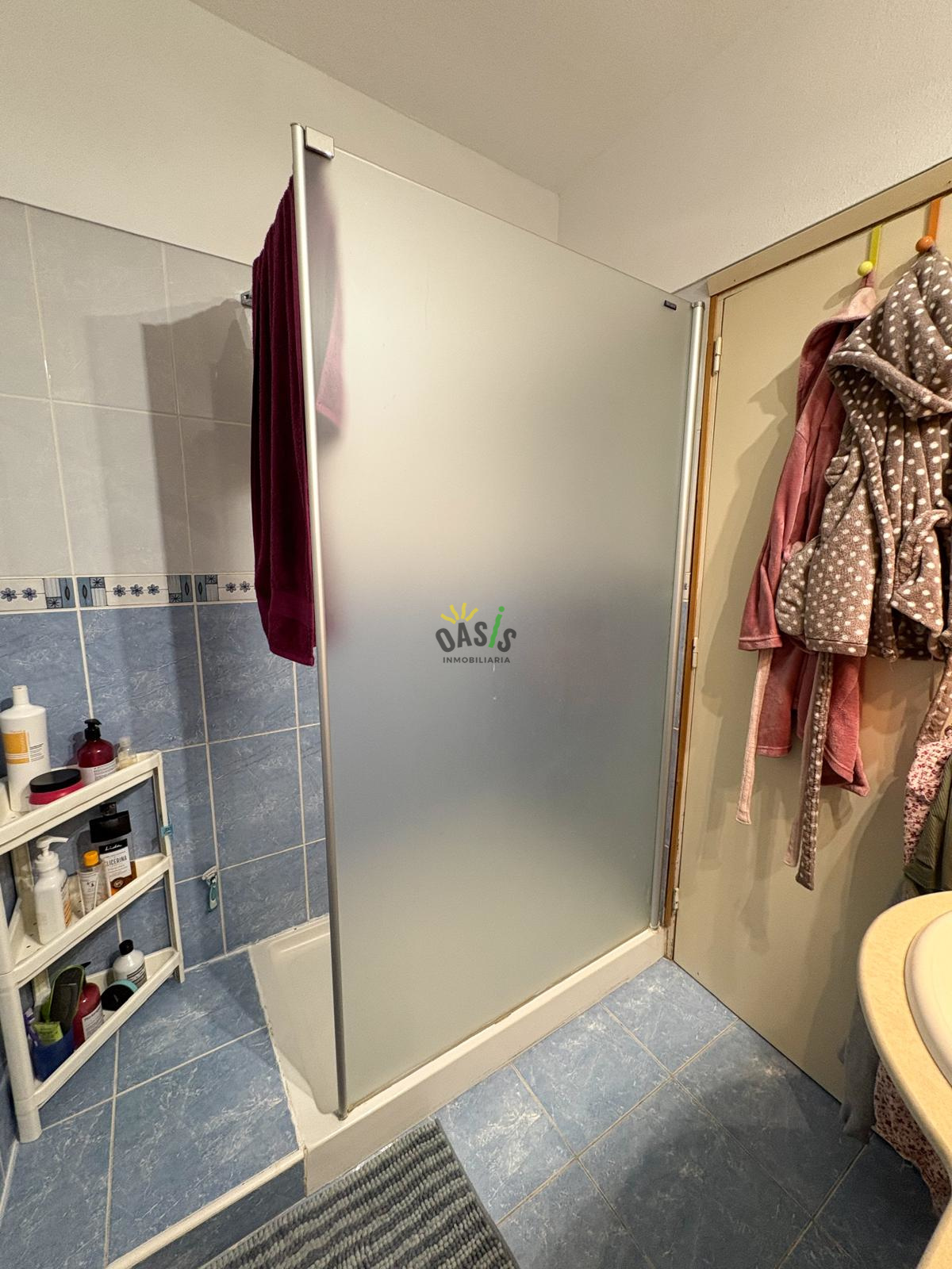 con una ducha con mampara de cristal y de un lavado con mueble a medida.