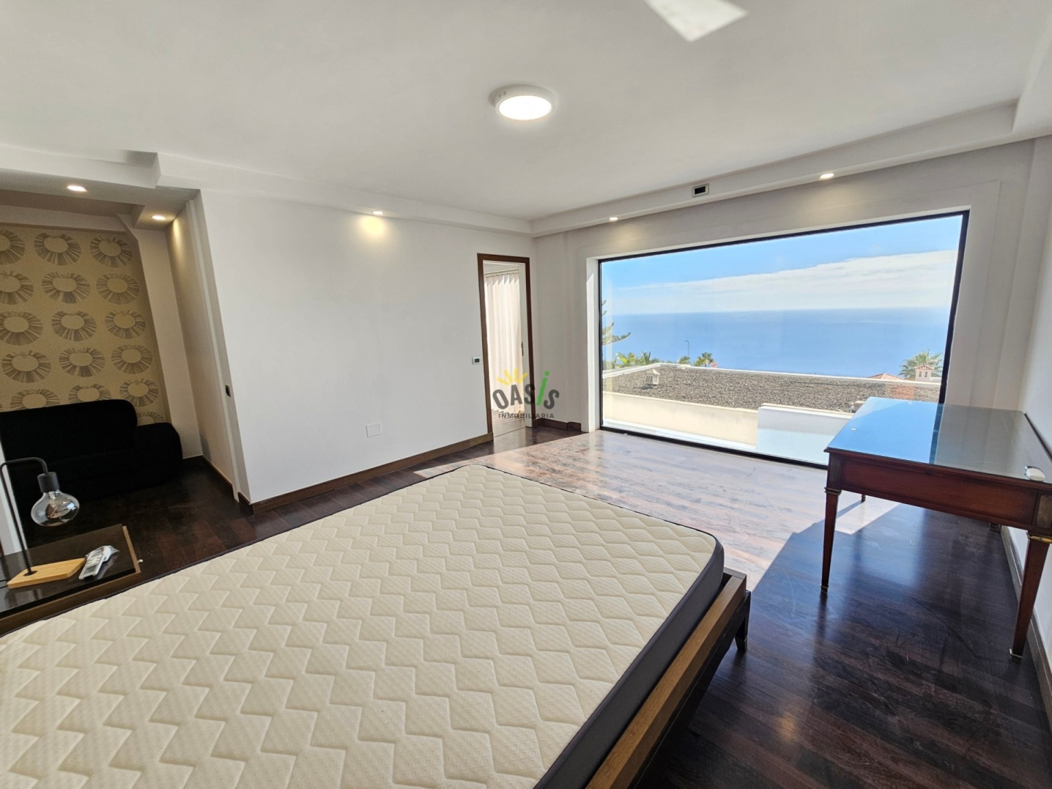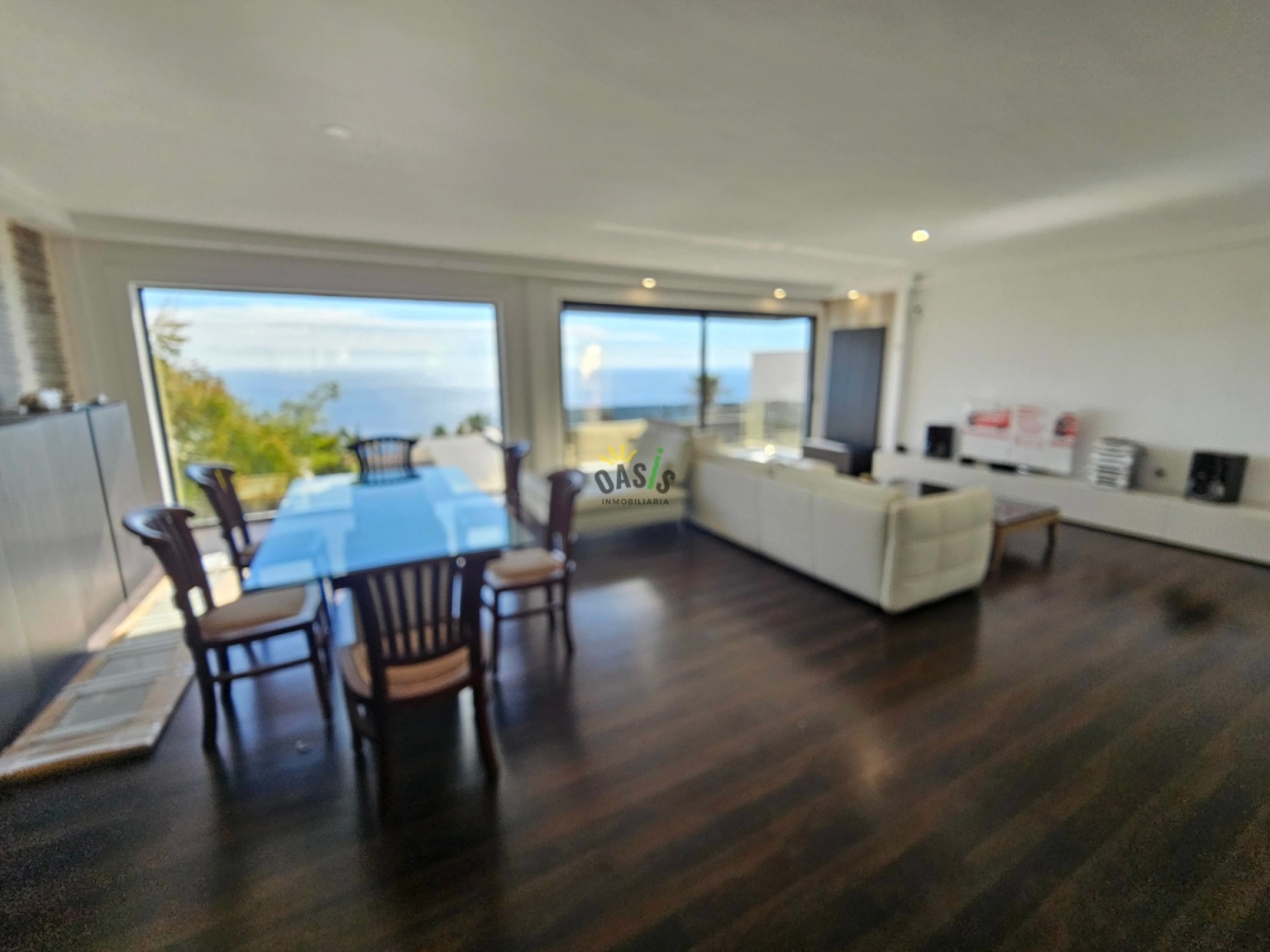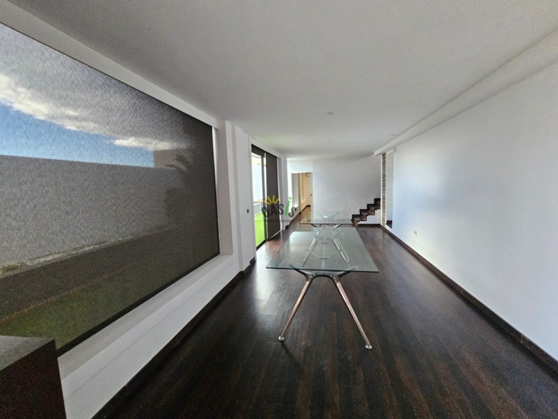 Entramos en la casa por la planta alta donde se ubica un amplio salón comedor de unos 50 m2 con grandes cristaleras orientadas al mar, aportando luminosidad y elegancia a la casa, además cuenta con una majestuosa cocina abierta, totalmente amueblada y equipada con una amplia isla central y gran capacidad de almacenamiento. La misma planta cuenta con 2 amplios dormitorios uno de ellos en suite con  vestidor de considerable tamaño, orientado hacia el mar junto con el gran baño. Además, hay otro baño para asistir al otro dormitorio y la planta de salón y cocina.