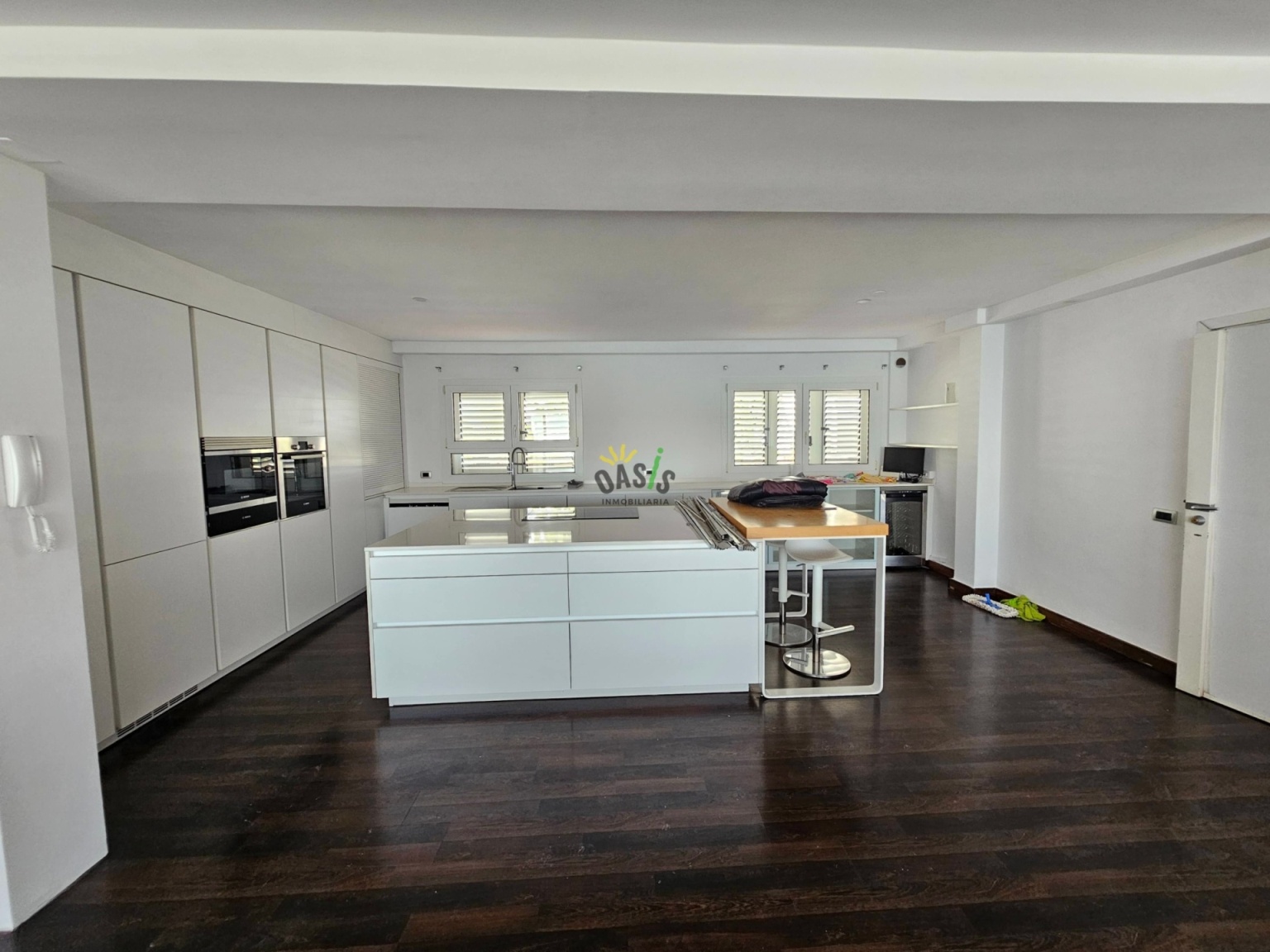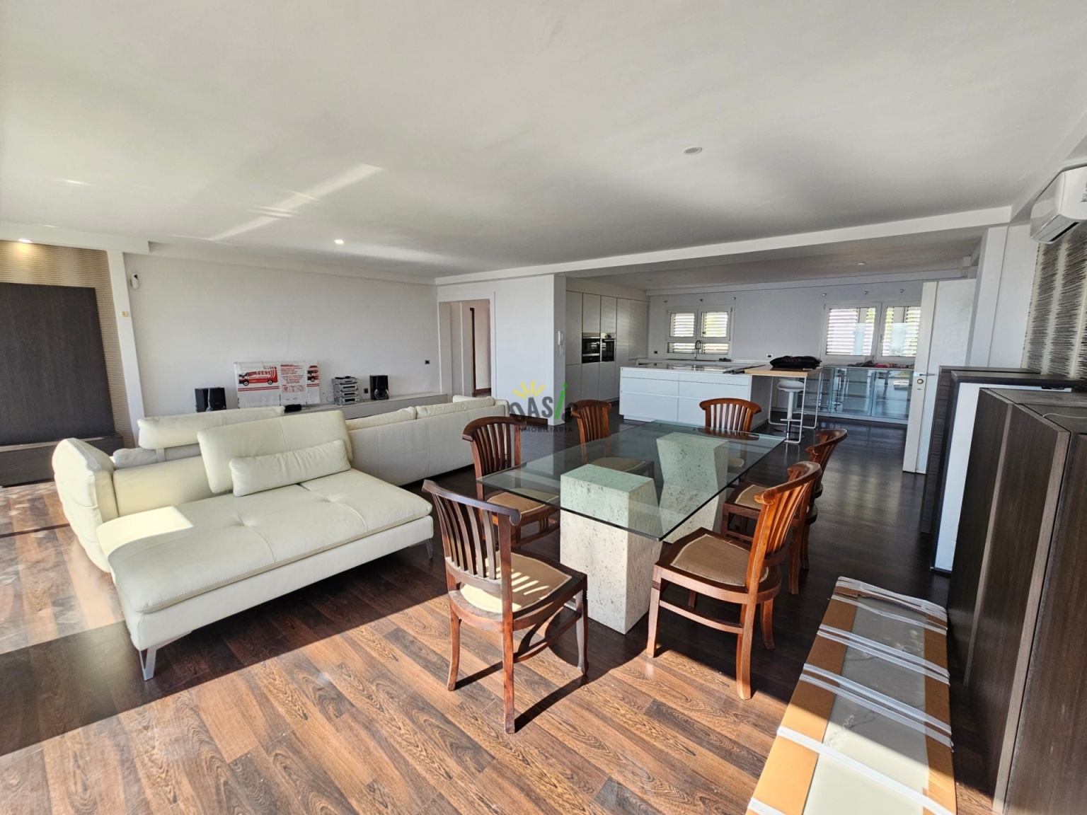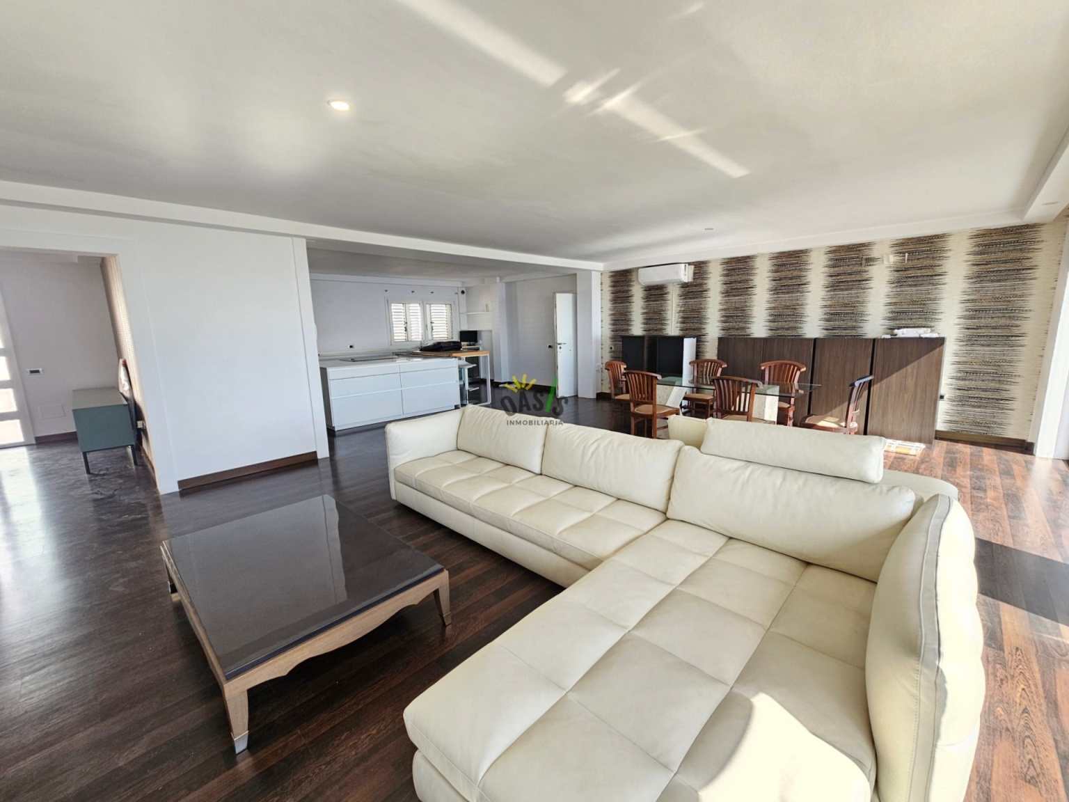 Entramos en la casa por la planta alta donde se ubica un amplio salón comedor de unos 50 m2 con grandes cristaleras orientadas al mar, aportando luminosidad y elegancia a la casa, además cuenta con una majestuosa cocina abierta, totalmente amueblada y equipada con una amplia isla central y gran capacidad de almacenamiento. La misma planta cuenta con 2 amplios dormitorios uno de ellos en suite con  vestidor de considerable tamaño, orientado hacia el mar junto con el gran baño. Además, hay otro baño para asistir al otro dormitorio y la planta de salón y cocina.